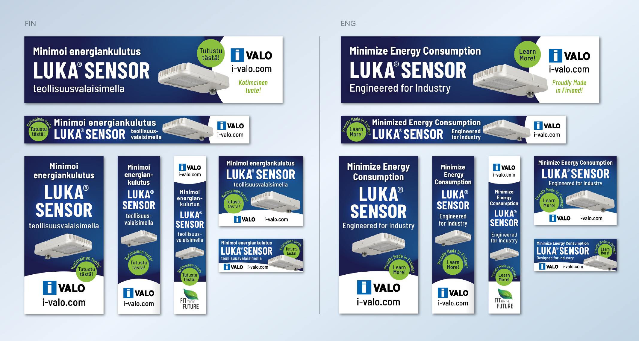 Suunnittelin kahdelle eri valaisimelle digitaaliset ilmoitukset eri kokoihin sekä suomeksi että englanniksi. Pienikokoisissa digitaalisissa ilmoituksissa tärkeintä on helppolukuisuus. Ilmoituksia ei katsota kauan, joten on tärkeää, että viesti tulee yhdellä vilkaisulla luetuksi. Lisäksi visuaalisesti tyylikkäät ilmoitukset tukevat positiivisia mielikuvia luotettavasta ja laadukkaasta yrityksestä ja houkuttelevat klikkaamaan ilmoitusta. Haasteena oli sovittaa eri kokoisiin ilmoituksiin kaikki teksti niin, että ne pysyvät selkeinä sekä luettavina pienestä koosta huolimatta. Mielestäni onnistuin hyvin luomaan laadukkaan ja houkuttelevan näköisen lopputuloksen tuotteen ilmoituksesta.