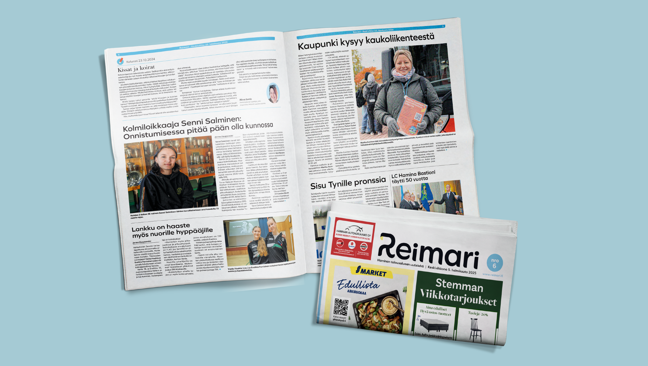 Haminalainen paikallislehti Reimari uudistui. Suunnittelin lehdelle uuden raikkaamman ja modernimman visuaalisen ilmeen. Olen myös taittanut viikottain ilmestyvän Reimarin vuodesta 2023 alkaen. Lähtökohtia visuaalisen ilmeen suunnittelulle oli paikallisuuden korostaminen, helposti lähestyttävyys sekä tietenkin helppolukuisuus.