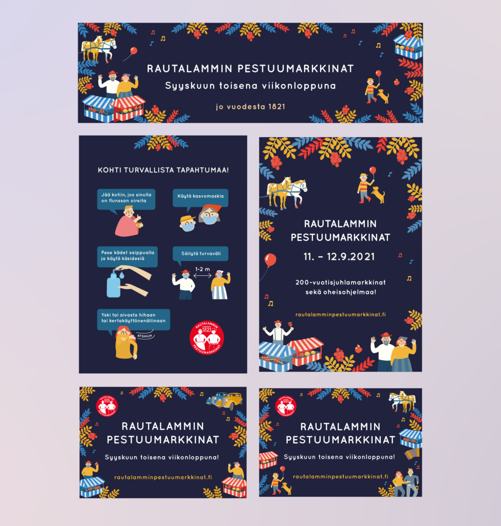 Suunnittelin uudistuneen ilmeen Rautalammin Pestuumarkkinoiden 200-juhlavuoden kunniaksi. Ilme on helposti lähestyttävä, monipuolinen, tunnistettava sekä ottaa huomioon kaiken ikäiset markkinavieraat. Ilme houkuttelee visuaalisuudellaan osallistumaan tähän syksyiseen ja lämminhenkiseen tapahtumaan.