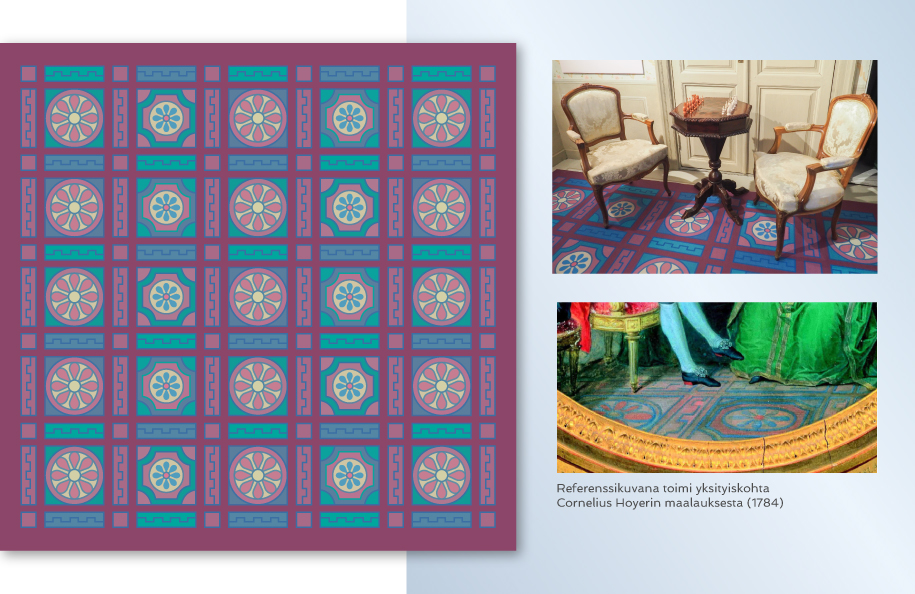 Tunnelmaa neuvottelutilaan tuo matto, jonka suunnittelin Cornelius Hoyerin maalauksessa näkyvän maton pohjalta. Kyseinen maalaus vuodelta 1784 kuvastaa Katariinan ja Kustaan neuvottelutilannetta. Matto on 337 x 350 cm kokoinen. Työvälineenä käytin Adobe Illustratoria.