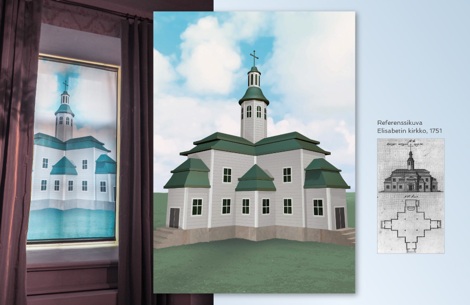 Museoiden toiveena oli saada valoverhoon kuvituskuva Elisabetin kirkosta, joka sijaitsi Haminassa tuolloin neuvottelujen aikana vuonna 1783. Referenssinä toimi pohjapiirros kirkosta sekä vanha karttakuva, jonka avulla päättelin mistä perspektiivistä kirkko olisi tuolloin ikkunassa näkynyt. Toteutin kirkon 3D-ohjelma Splinellä ja viimeistelin Photoshopissa. Verho on 186 x 133 cm kokoinen.